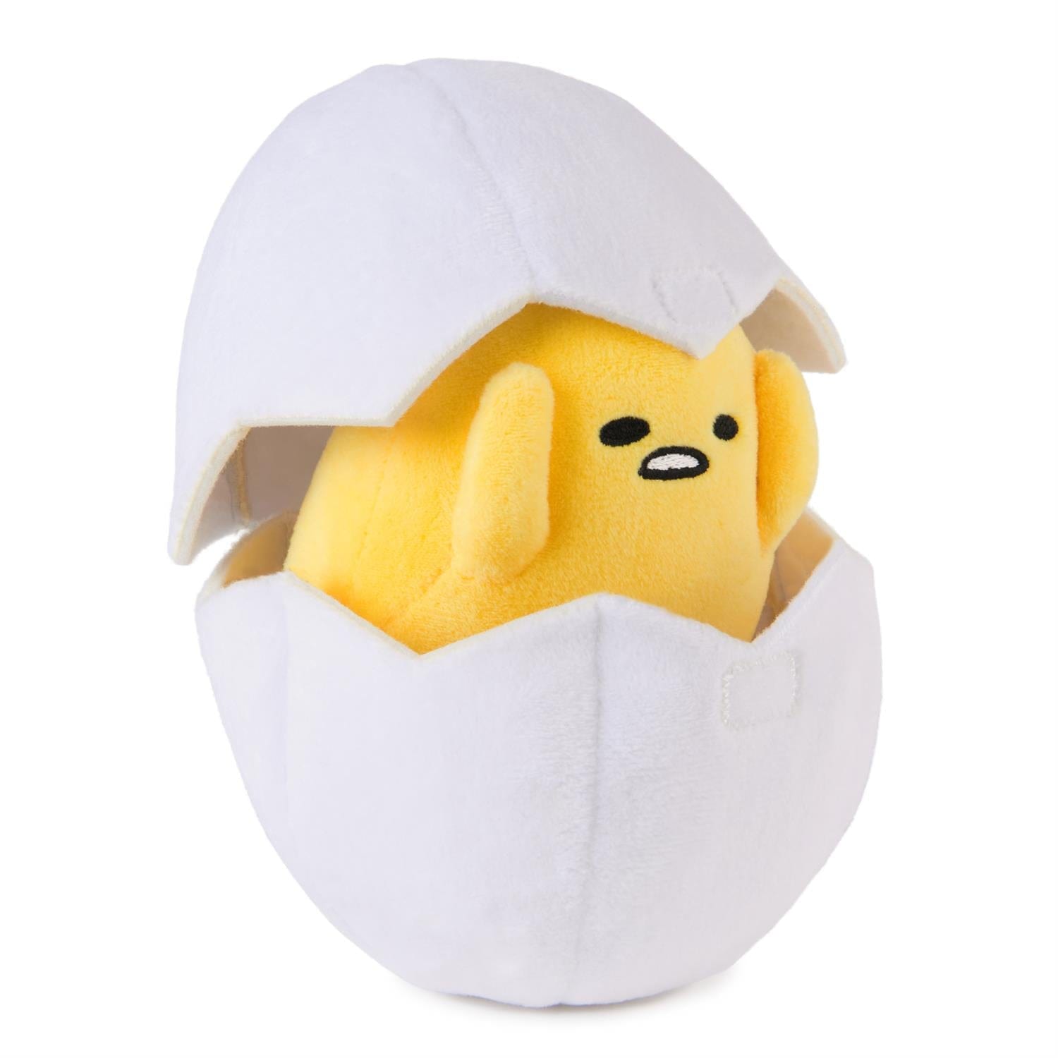 The lazy egg from the world of Sanrio arrives as a 5 yolk inside a cracked eggshell, with an alarmed expression and raised arms. The soft, structured eggshell has a white plush exterior and Velcro enclosure.