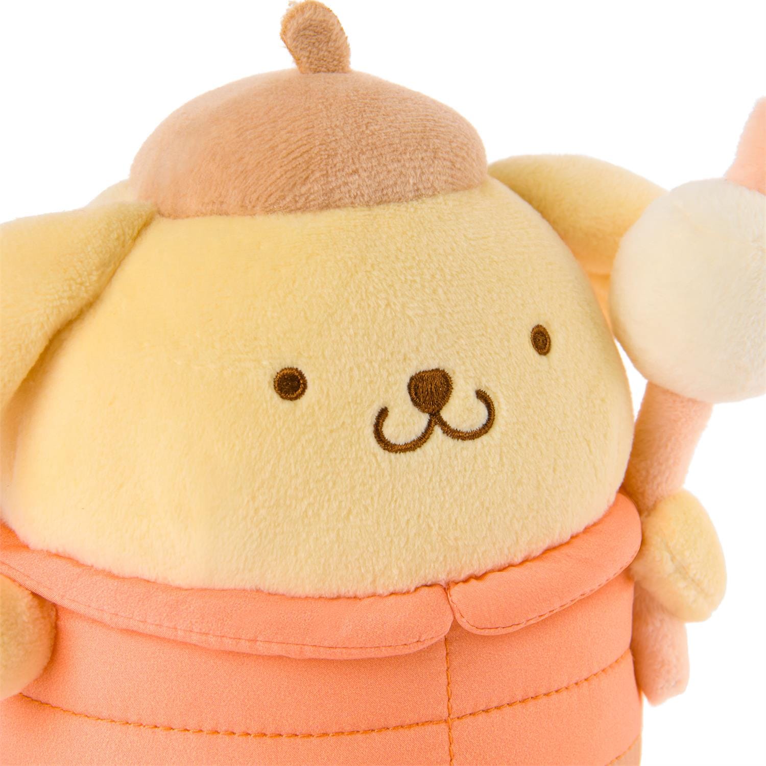 - Camping Pompompurin: This 6` plush shows Pompompurin dressed for outdoor fun in his signature beret and a cozy orange and brown jacket. He also has brown embroidered details and holds a stick with a tasty marshmallow, ready to be toasted!